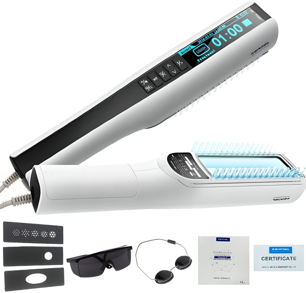 - Grzebień do utrzymania odpowiedniej odległości od skóry głowy. Grzebień można zdejmować, aby naświetlać punktowe zmiany na ciele.